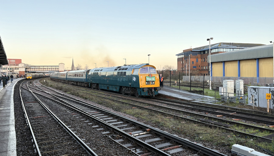 This eagerly-awaited railtour certainly did not disappoint. Not only was it the first trip of the year for Western Champion, but also its first run on the main line in BR blue livery with full yellow ends since its last day in traffic in December 1976. And perhaps more importantly, the Vintage Trains stock had proper opening windows!